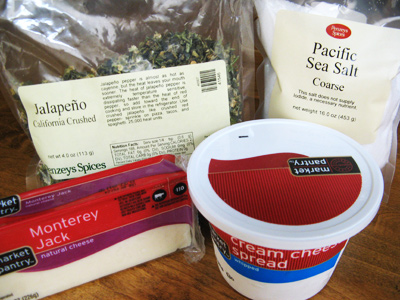Mix cream cheese, Monterey Jack cheese, Jalapeno flakes and salt together in medium bowl.