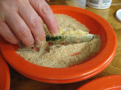 Fill each Jalapeno half with a generous amount of cheese filling. Dredge each Jalapeno half first in flour, then egg and finally in the bread crumbs and place on a cookie sheet lined with aluminum foil with cooking spray. Drizzle with olive oil and place in pre-heated oven at 425 degrees for 20 minutes or until cheese starts to bubble and topping starts to brown.
