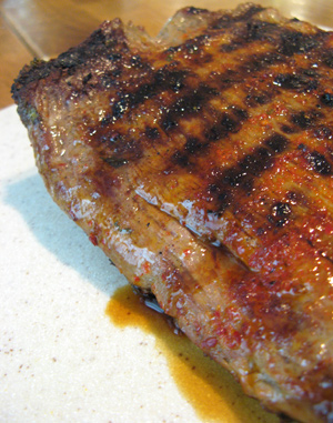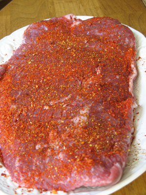 Sprinkle NM red chile and chile de arbol over both sides of the flank steak. Cover and refrigerate 2 hours or longer.