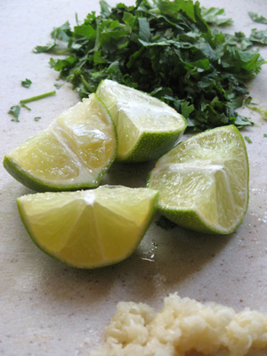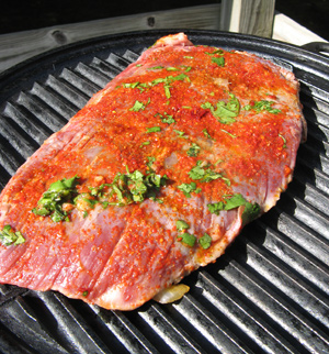 Just a bit more flavoring to be added to the steak. Before we put it on the grill add a couple cloves of minced garlic, juice of one lime and 1/4 cup of chopped cilantro.
