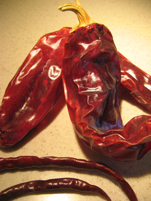 You can see the difference in color between the bright red NM chile and the chile de arbol.