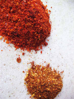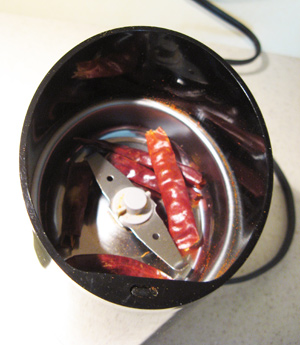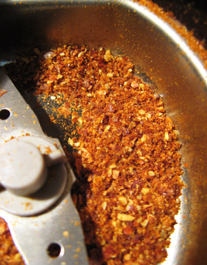 It all starts with the chile powder. If you have a coffee grinder and some dried chile, it’s fun to make your own chile powder. I used 3 Red NM chiles and 2 Chile de Arbol. If this isn’t an option, substitute ancho chile powder, smoked paprika, and cayenne.