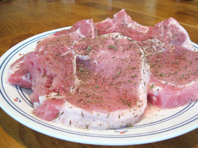 Fill a ziplock bag with 2 cups water, 1 T salt and 1 T sugar, add pork chops and refrigerate several hours or overnight.