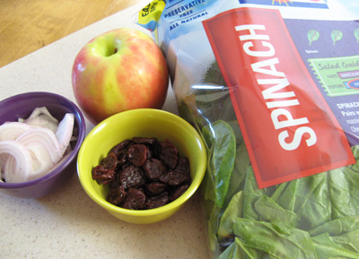 The salad consists of Spinach, 1 sliced apple, 1/4 cup dried cherries, 1/4 cup sliced shallots and 1/4 cup cranberry juice. Must have been in a hurry when taking pictures, I forgot the cranberry juice.