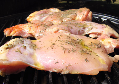 Combine salt, pepper, thyme and garlic together to make a paste. Rub on both sides of chicken thighs, drizzle with olive oil and place on a hot grill. Grill chicken over medium high heat approximately 5 – 7 minutes on each side. (Not too high or the chicken will burn). When the chicken has browned on both sides and juices run clear it’s ready.