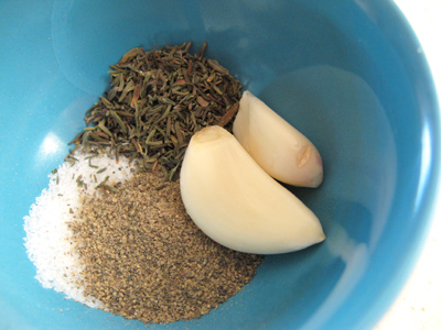 I started with some seasoning for the chicken. Salt, pepper, thyme and garlic made a little paste for the chicken.
