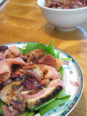 Assemble salad with spinach, top with grilled chicken slices, cherry apple mixture with brown sugar pecans sprinkled on top.