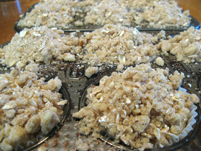 The streusel ingredients include flour, brown sugar, oats, butter, walnuts and a little cinnamon.
