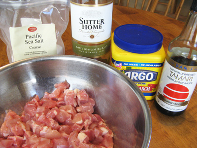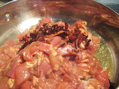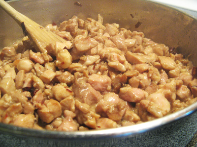 You can choose chicken thighs or breasts for this dish. I cut 1 1/2 pounds of chicken thighs into small bite size pieces.