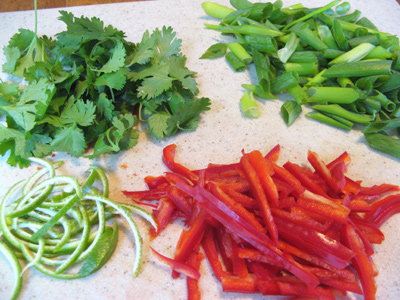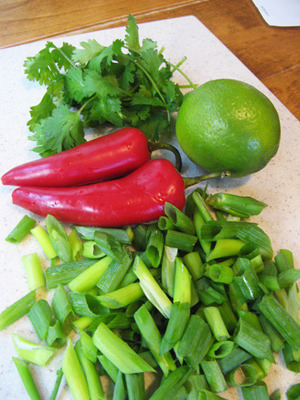 The green onion tops will go in with the chicken when it’s cooking and I’ve decided to add a little red fresno pepper, fresh cilantro and lime zest curls to go on top.