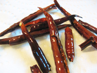 You’ll need some dried red chili peppers. If you want it hotter, leave some of the seeds intact. Otherwise remove the stem and seeds.
