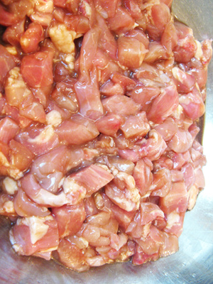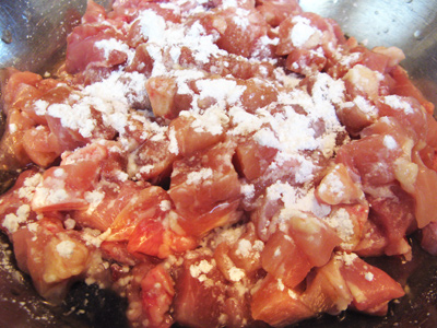 Season the diced chicken with 2 tablespoon soy sauce, salt and white wine. Sprinkle with 2 tablespoons cornstarch and mix well. Set aside.