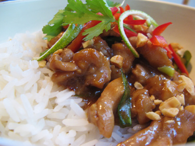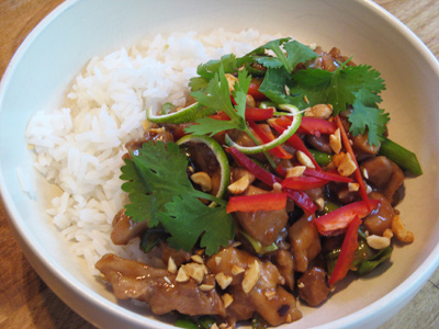 And here’s my Kung Pao Chicken with Jasmine Rice. Sprinkle on some peanuts, red pepper, lime slivers, and cilantro if you wish. It sure was tasty with all that goodness on top.