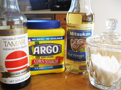 Make the sauce by first dissolving 2 tablespoons cornstarch in 1/2 cup chicken broth. Combine 2 tablespoons rice vinegar, 2 tablespoons sugar, 1/4 cup soy sauce. Add the cornstarch mixture to the sauce and whisk until all ingredients are well blended. Add the grated ginger and minced garlic.