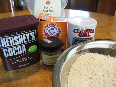 The dry ingredients are flour, cocoa, baking soda, baking powder, salt and cinnamon.
