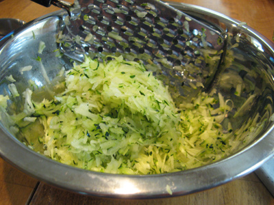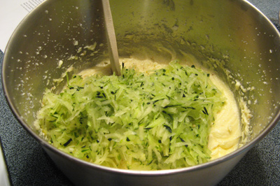 Using a mixer, beat together the butter and sugar until they are thoroughly blended. Add the eggs to the mixture one at a time, beating well after each egg. Using a wooden spoon, fold in the vanilla, orange peel, and zucchini to the mixture.
