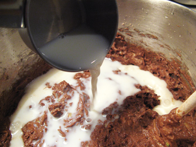 Add the dry ingredients alternately with the 1/2 cup milk to the zucchini mixture. Blend well.