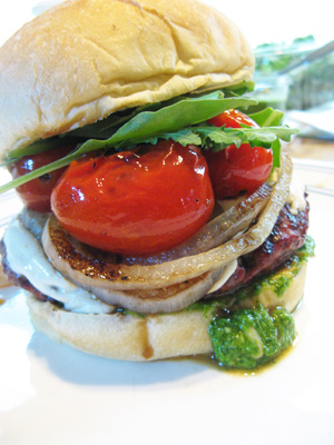 Nothing beats a good burger don’t you think. I like to layer a burger so that when you take that first bite you can taste all the different flavors that are going on. This pesto burger has balsamic roasted tomatoes that will burst in your mouth both literally and figuratively. You will need plenty of napkins because it will drip down your chin good . . . with arugula pesto and roasted tomato juiciness. The mess will be worth it, I promise.