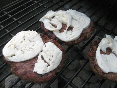 When your burger is a couple minutes from being ready, place the slices of fresh mozzarella on to melt.
