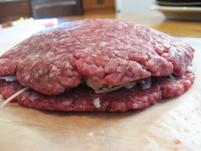Set the second patty on top of all that cheese and green chile and start to pinch together the edges until it’s securely sealed.
