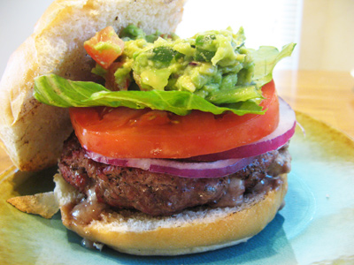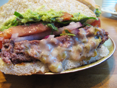 You’d better come hungry because this is the ultimate burger with 2 patties of ground beef glued together with cheese and green chile. You may not see it now but within this burger lies a volcano of cheese and green chile just waiting to erupt. I found a recipe for a stuffed burger in Chile Pepper Magazine 1996 and ever since then my family has hounded me to make them again and again. The original recipe wrapped a couple strips of bacon around the patties so if that sounds good, go for it. I know that for me, I can only eat half, between the burger itself and all the toppings that are piled on it’s a lot for any one person but it’s sure fun to try.