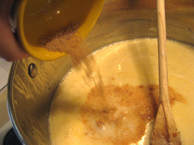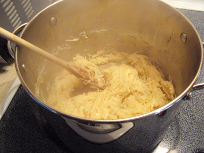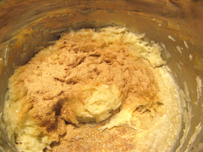 After about 5 minutes the grated potatoes and onions should be starchy, pasty goo and the bottom of the pot a nice brown color. Add 2 tablespoons of the seasoning mixture and stir.