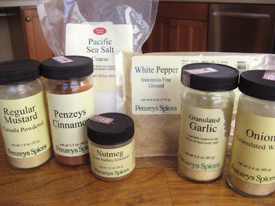 You may have noticed, I like to layer my spices so they look pretty. We’ve got salt, dry mustard, onion and garlic powder, white pepper, nutmeg and cinnamon.