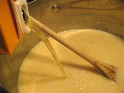 Add 3 cups more stock and scrape the bottom of the pot and bring to a boil.