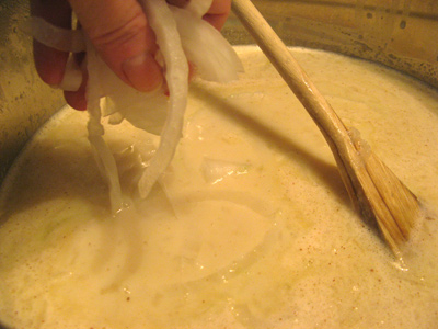 Add the onion slices. Stir the pot and scrape the bottom from time to time. Bring the mixture to a boil and then turn down the heat and simmer for 15 minutes. Make sure to keep watch on the pot so it doesn’t boil over. You don’t know how many times this soup has gotten away from me and boiled over. Actually I almost boiled this pot of soup over but don’t tell anyone.