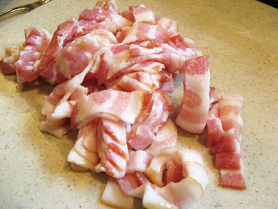 While the soup is simmering, it’s a great time to get out the bacon and slice it into small pieces. I used 8 slices of bacon.
