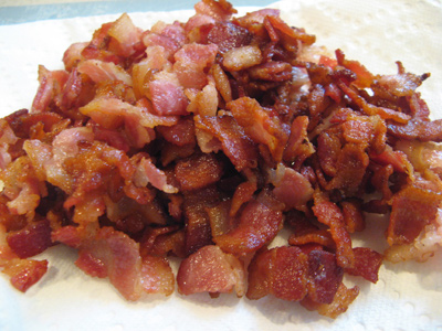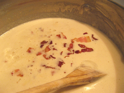While the soup is simmering, place the cut bacon slices into a skillet and cook until crisp. Remove to a place lined with a paper towel. Set aside.