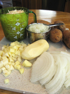 Slice the other half of the onion into thin slices. Peel potatoes and grate 3 cups of potatoes and the remaining into a small dice. Should be about 8 cups of potatoes in all.