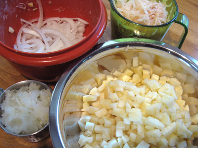 Cut a large onion in half and grate 1/2 onion on the large holes of a hand grater making 1 cup. Slice the remaining 1/2 onion into thin slices. Peel the potatoes and using the hand grater, grate enough potatoes to make 3 cups. Cut the remaining potatoes into a small dice. There should be 8 cups of potatoes in all.