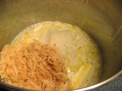 Once the butter has melted, add the grated potatoes and onions. Stir the pot with a wooden spoon, scraping the bottom of the pot when the mixture begins to stick.