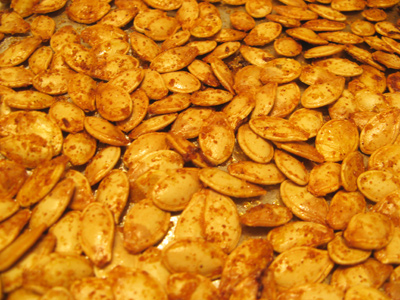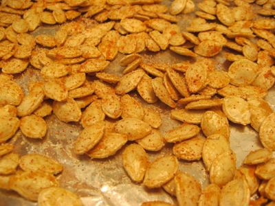 Preheat the oven to 300 degrees. Spread the seeds so that they don’t clump together. Sprinkle a little more seasoning. Use as little or as much as you want.