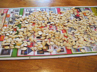 After the pumpkin has been carved and all the pulp and seeds removed, wash the seeds and spread them out on a newspaper to dry.
