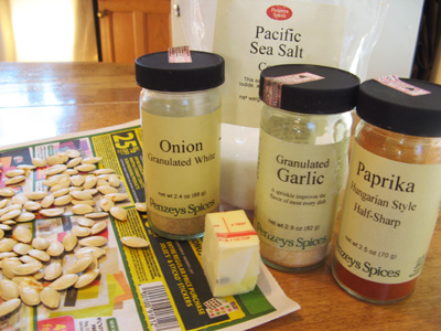 Pour melted butter into a bowl with pumpkin seeds and stir. Mix together the salt, paprika, onion and garlic powders and sprinkle about half of the mixture onto the pumpkin seeds. Stir together to coat all the seeds. Place pumpkin seeds on a cookie sheet lined with aluminum foil. Spread the seeds single layer so that they don’t clump together.
