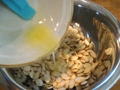 Sprinkle a little seasoning on the seeds and give them a stir. Line a cookie sheet with aluminum foil and spread the pumpkin seeds.