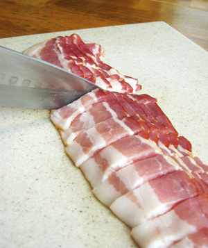While the tomatoes are roasting, slice the bacon into 1/2 inch slices.