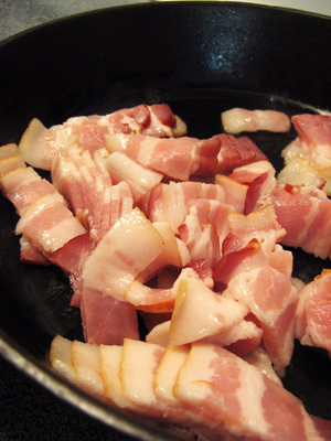 I like to give it a stir with a wooden spoon and the bacon pieces will separate and cook evenly into crisp little bite size pieces. Once they are cooked remove the bacon pieces to a plate lined with a paper towel.