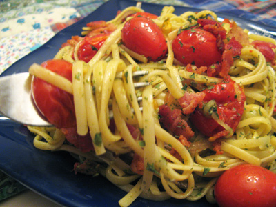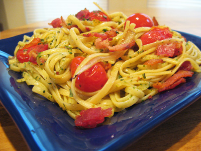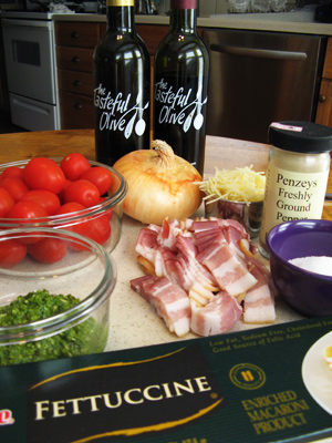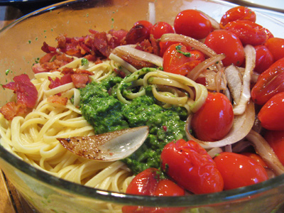 I used fettuccine because I had it on hand, but another pasta would work just as well. For the 1 box of pasta I added 6 slices of bacon, 2 cups of cherry tomatoes, spinach or arugula pesto, 1/2 onion, parmesan cheese, balsamic vinegar and olive oil, plus salt and pepper.