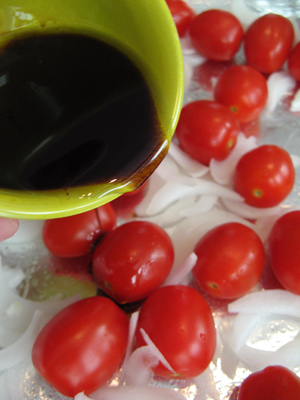 Place the cherry tomatoes and onion slices on an aluminum lined cookie sheet. Whisk together 2 tablespoons balsamic vinegar and 2 tablespoons olive oil and pour over the tomatoes and onions.