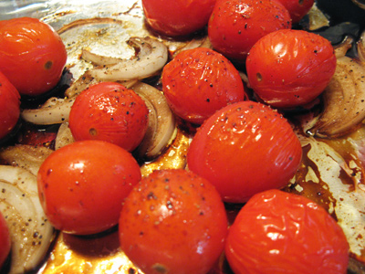 Preheat oven to 400 degrees. Place cherry tomatoes and sliced onions on a cookie sheet lined with aluminum foil. Whisk together the balsamic vinegar and olive oil and pour over the tomatoes and onions; sprinkle with salt and pepper. Roast in 400 degree oven for 10 minutes until tomatoes are just about bursting.