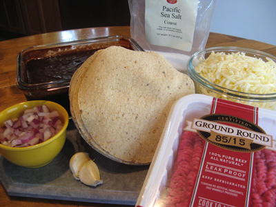 The sauce now ready, it’s time to make the enchiladas. You’ll need some corn tortillas, ground beef, about 1 1/2 pounds for 4 enchiladas; some onion, garlic and salt to season the meat. And lots and lots of cheese. Monterey Jack was my choice but cheddar or any Mexican cheese will work as well.