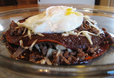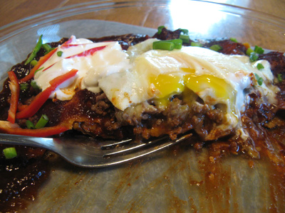 Fry an egg in non-stick pan coated with cooking spray. Gently lay on top of stacked enchilada. Place enchilada in 350 degree oven for 5 – 7 minutes until cheese melts and enchilada is heated throughout. **Note, for a runny egg yolk, under cook slightly before placing on top of enchilada. The egg will finish cooking in the oven while the cheese melts and heats the enchilada.