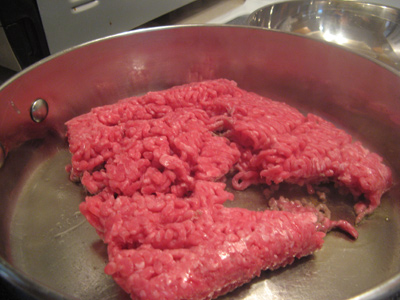 In a large stainless steel pan over medium high heat brown your ground beef.
