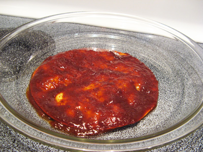 I’ve heated the enchilada sauce in a saucepan on the stove. Dip the tortilla into the sauce to coat.