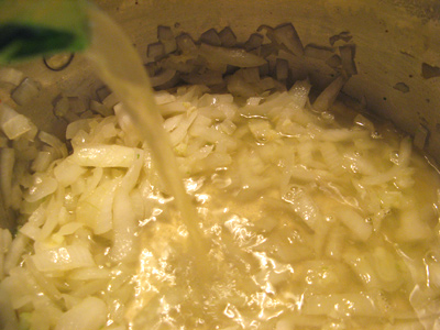 Pour 2 cups of chicken stock into the onion, garlic mixture.