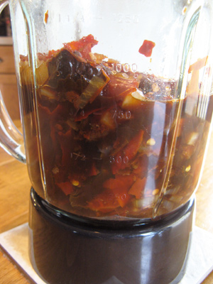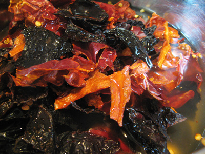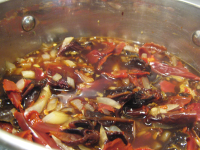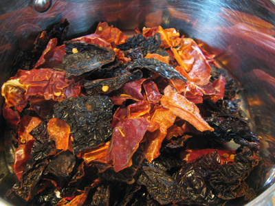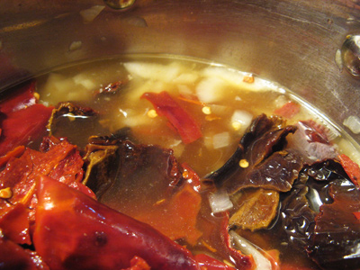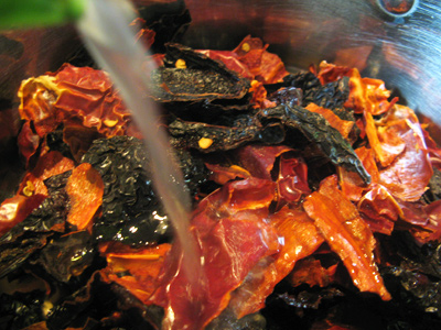 Bring the liquid up to a simmer, then remove from heat and let steep 20 minutes to soften the chile pieces.
