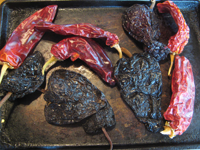 Arrange 10 chile pods on a cookie sheet and roast them in a 250 degree oven for 10 minutes or until the chiles become aromatic.